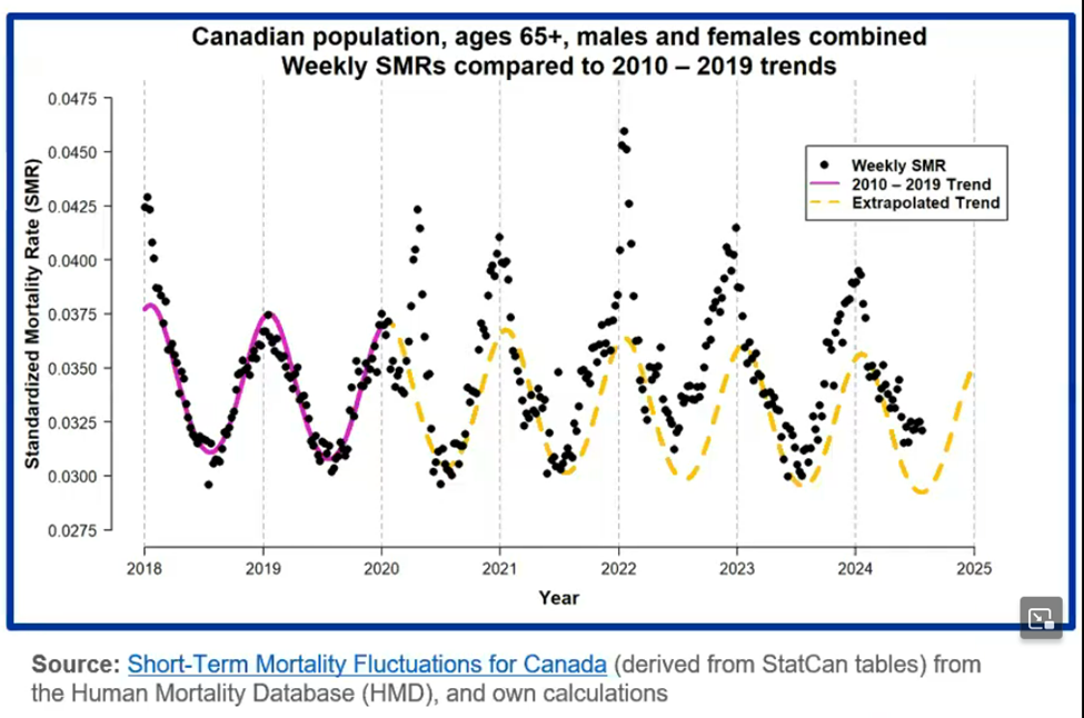 Here in Canada, a recent Canadian Institute of Actuaries webcast showed similar results for Canada – mortality continues at higher levels that before the pandemic – at least through mid-2024. The chart below shows weekly experience (black dots) compared to what we expected (yellow curve). Note that in Canada at least, rates of death are seasonal – higher in the winter / lower in the summer.